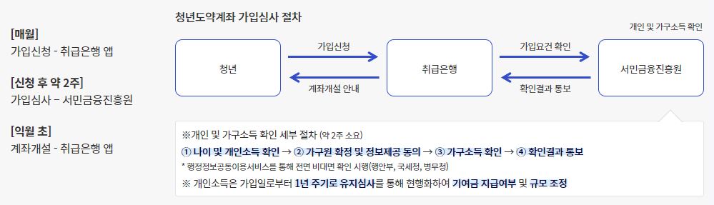 청년도약계좌 신청 시 아래의 심사절차를 확인하시기 바라며, 취급은행은 국민은행, 농협은행, IBK기업은행, 신한은행, 우리은행, 하나은행 등이 있으니 확인하셔서 계좌를 개설하시기 바랍니다.