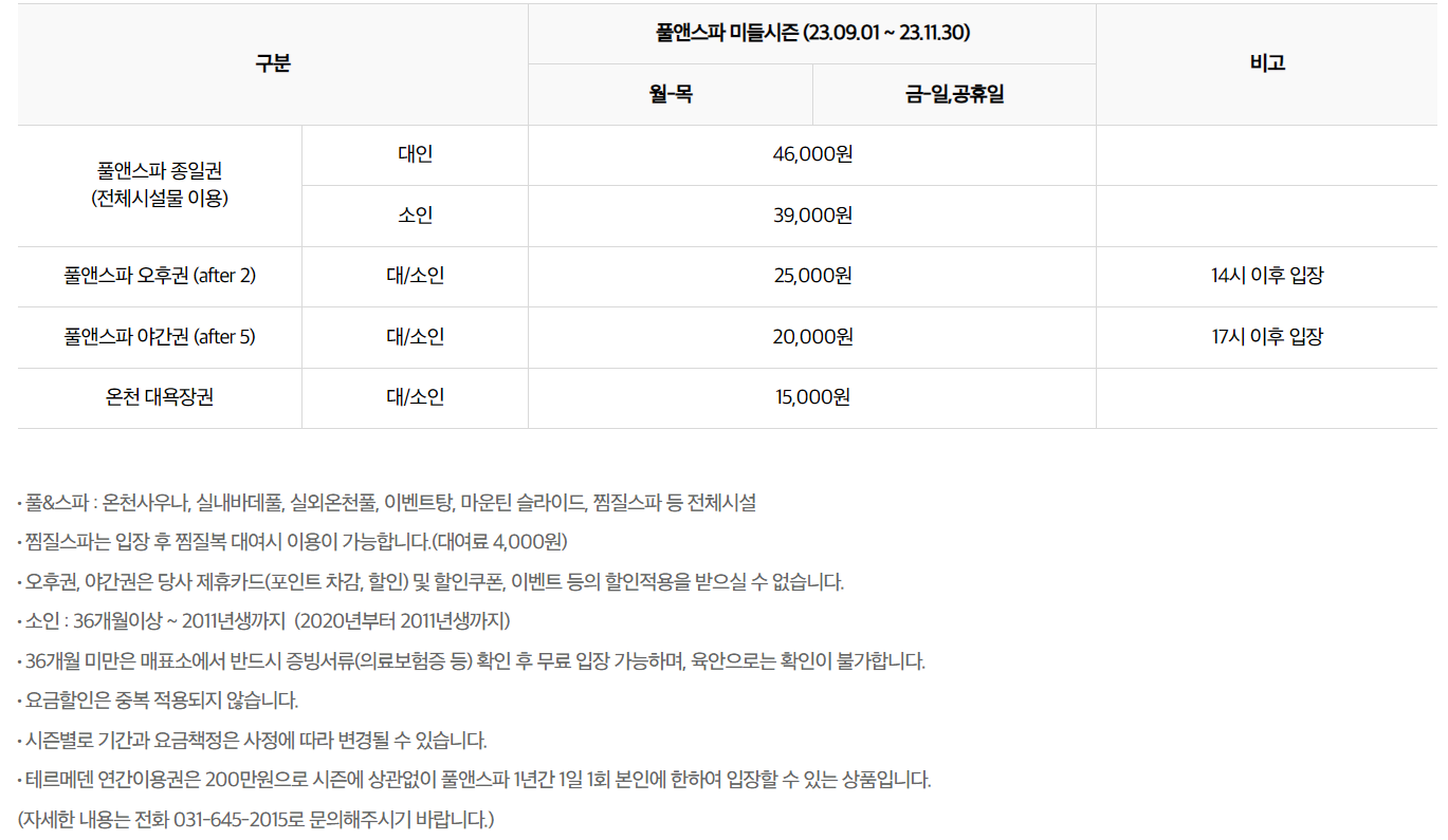 ㆍ제휴카드 할인은 각 시즌별 워터파크 입장요금을 기준으로 적용됩니다.